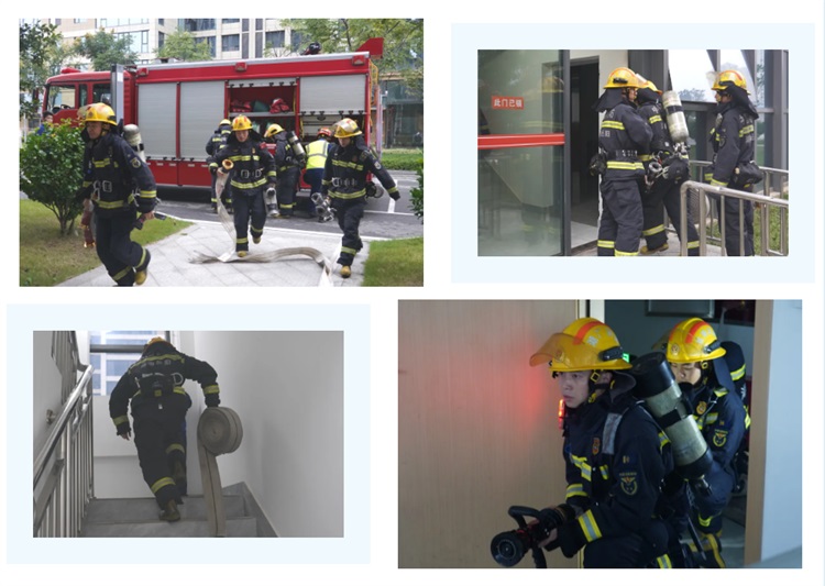 随后进入实战演练环节,模拟办公楼突发火情,消防控制室在接报后立即启动应急预案,消防站队员迅速抵达现场展开扑救,同时引导假设受困人员沿疏散通道撤离。整个演练过程衔接紧密、响应迅速,有效检验了企业应急预案的可行性与现场救援的协同处置能力。