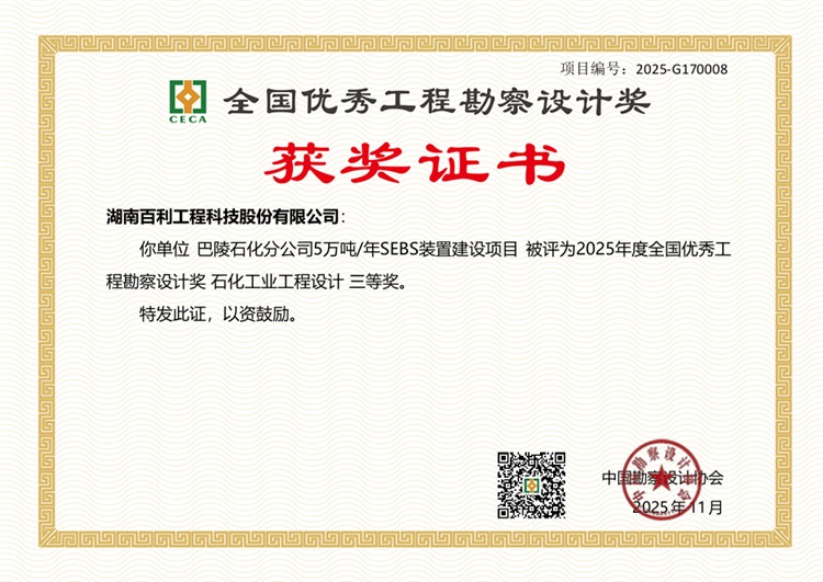 近期,由我司百利科技负责设计的“巴陵石化分公司5万吨/年SEBS装置建设项目”荣获“2025年度全国优秀工程勘察设计奖”石化工业工程设计三等奖,该奖项由中国勘察设计协会组织评审并颁发。