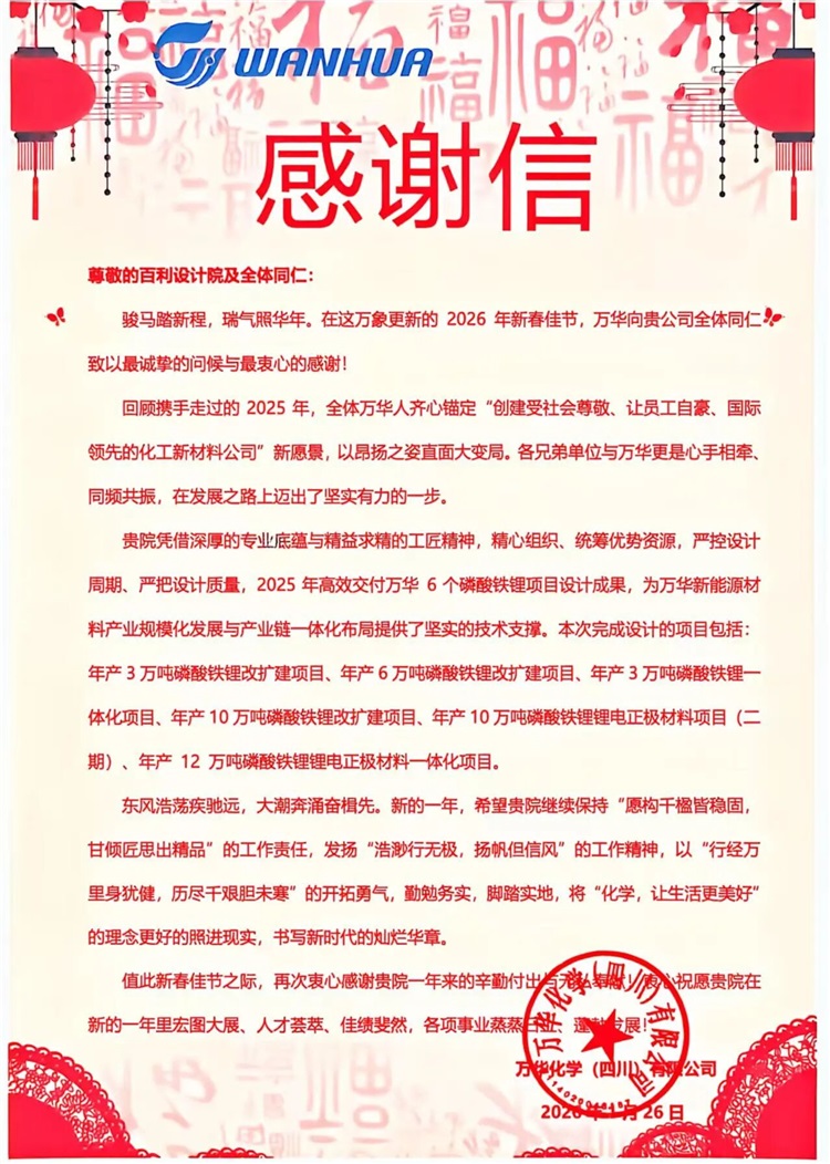 近日,百利科技喜获合作伙伴万华化学(四川)有限公司发来的感谢信。信中指出,百利科技团队在2025年的合作中展现出高度的专业协同精神,以深厚的行业积淀与精益求精的工匠态度,精心组织、统筹资源,精准把控设计周期与质量,高效完成了6个磷酸铁锂项目的设计交付任务,为万华化学在新能源材料产业的规模化发展与产业链一体化布局注入了强劲动力与可靠保障。